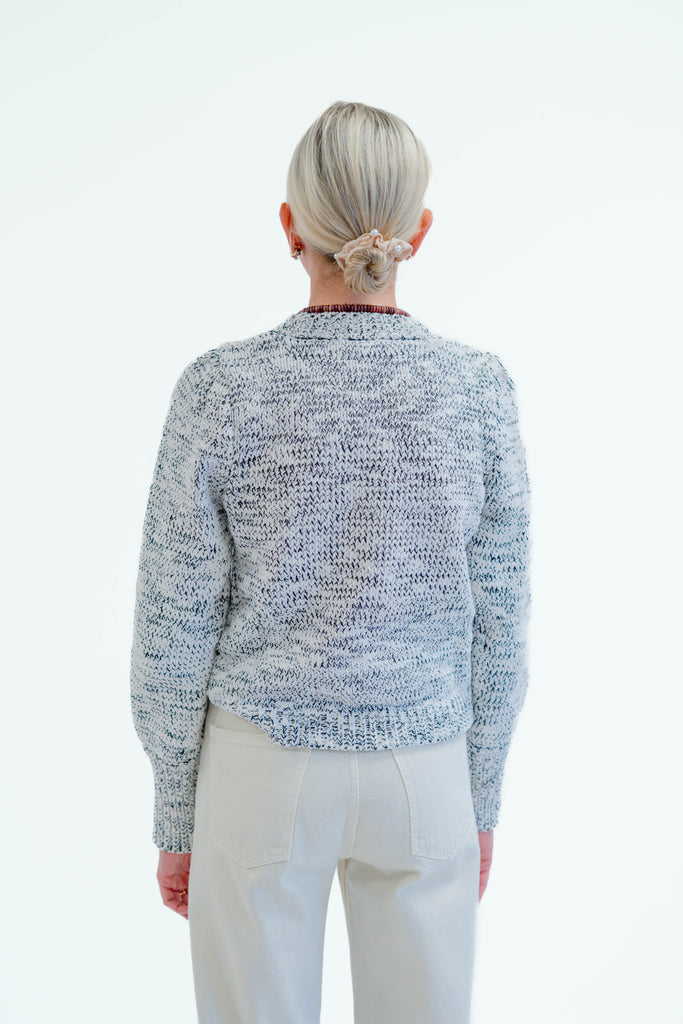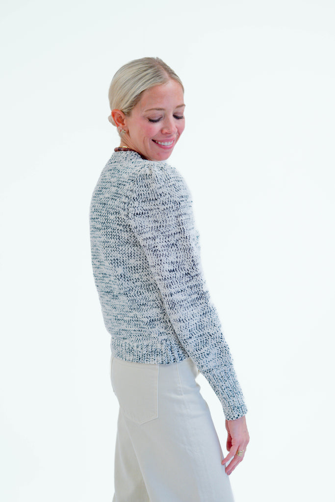 - Knit in a super soft and cozy chenille yarn with playful monochromatic spacedye yarns throughout. Designed with a crew neck shape and puff shoulder detail leading to an elongated fitted cuff sleeve. The body is slightly cropped in length.