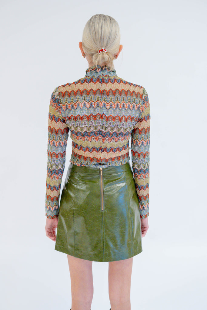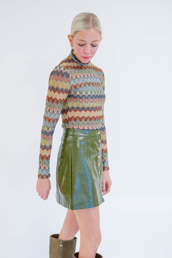 The Carla Skirt features a shiny faux leather with gold buttons down the center front. Fitted through the waist and high hip with an A line shape. Fully lined with a center back zipper closure in gold.