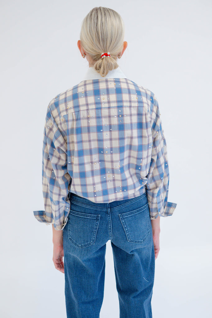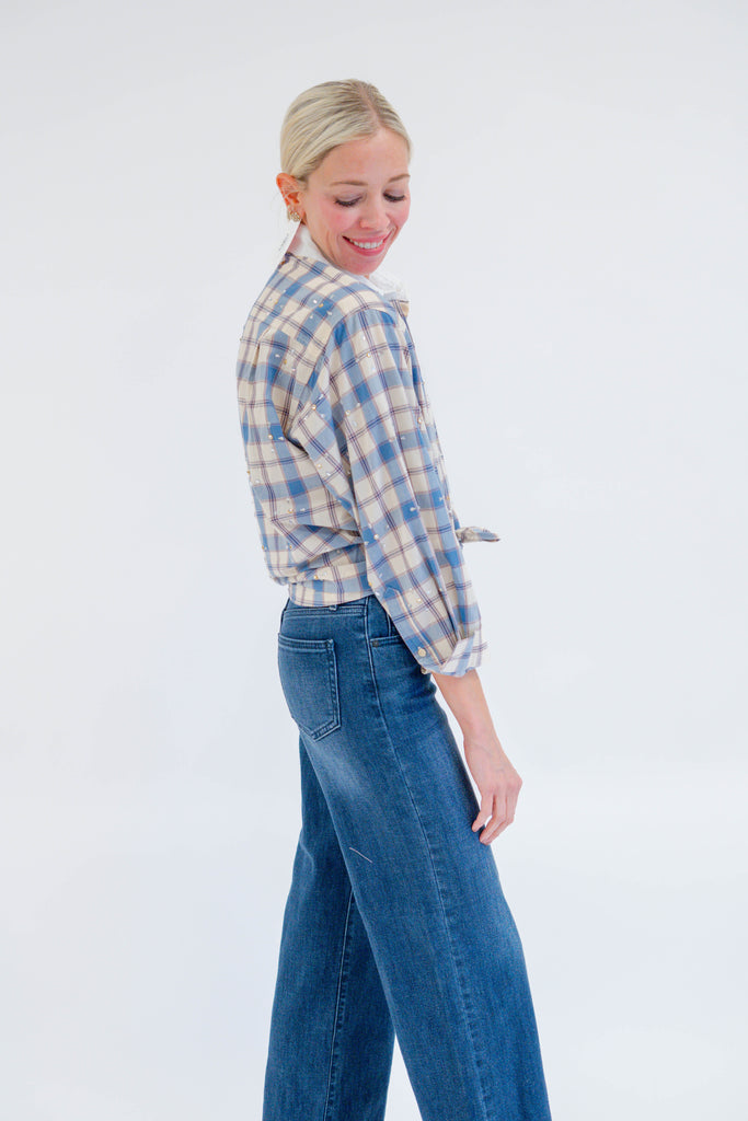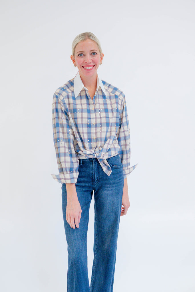 Shine meets classic plaid. The Amélie by Florez elevates an everyday button-up with allover rhinestone detailing that catches the light without feeling over the top. A crisp white contrast collar polishes the look, while the blue & off-white check keeps it timeless. Dress it up with a concho belt and boots or tuck it into denim for effortless, day-to-night style.