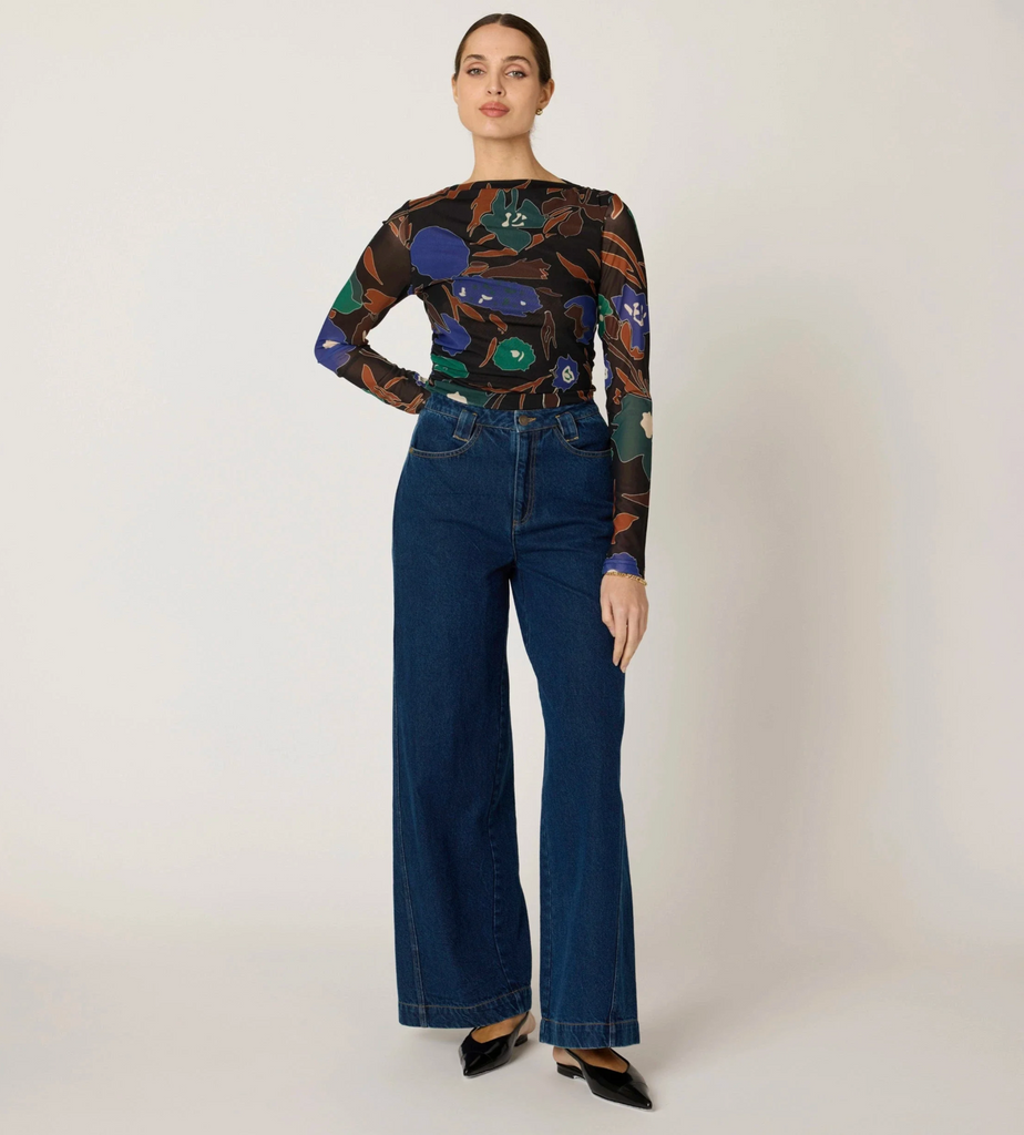 Ethically handmade in India from 88% nylon and 12% elastane, our best-selling Remy Top returns this fall in a dark floral Mariposa print. With its elegant high neckline and delicate shirring at the shoulders and waist, this flattering silhouette is a timeless piece designed to celebrate every body