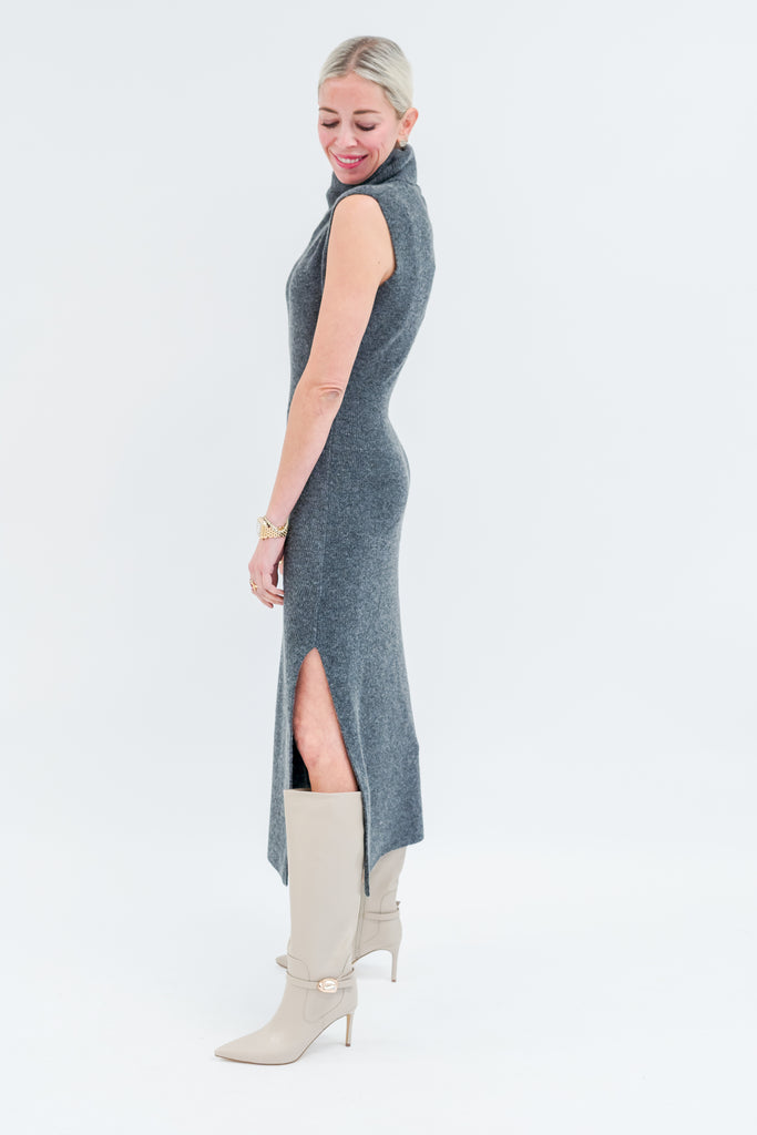 Effortless elegance meets cozy comfort in the Roxanna Sweater Dress. This sleeveless mock neck style layers beautifully over your favorite long-sleeve tee or stands solo for a polished look. The charcoal hue pairs with everything in your wardrobe, while the soft knit fabric keeps you warm without the bulk. Perfect for transitional weather or layering year-round—dress it up with boots or keep it casual with sneakers.