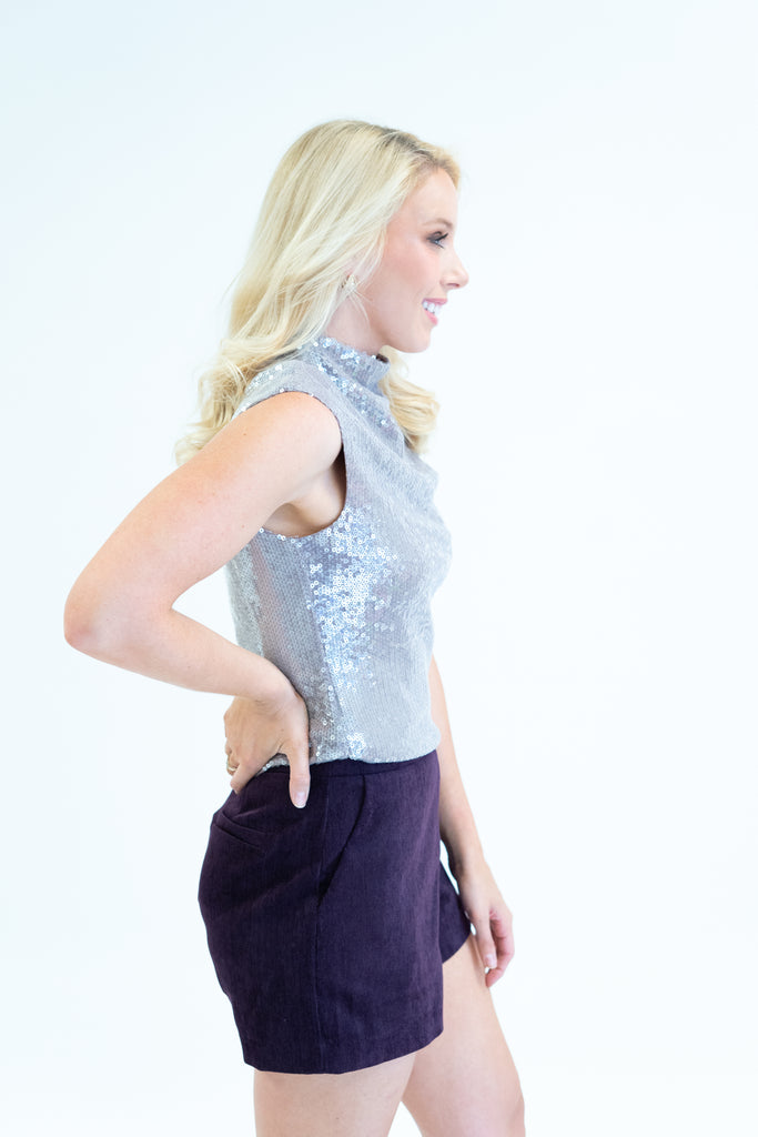 Elevate your evening wardrobe with the ELODIE Sabrina Sequin Top, a sophisticated mock neck shell that commands attention. Crafted with shimmering sequins, this piece delivers glamorous versatility—wear it solo for a statement look or layer it under blazers and jackets for refined polish. We love it paired with our burgundy skort!