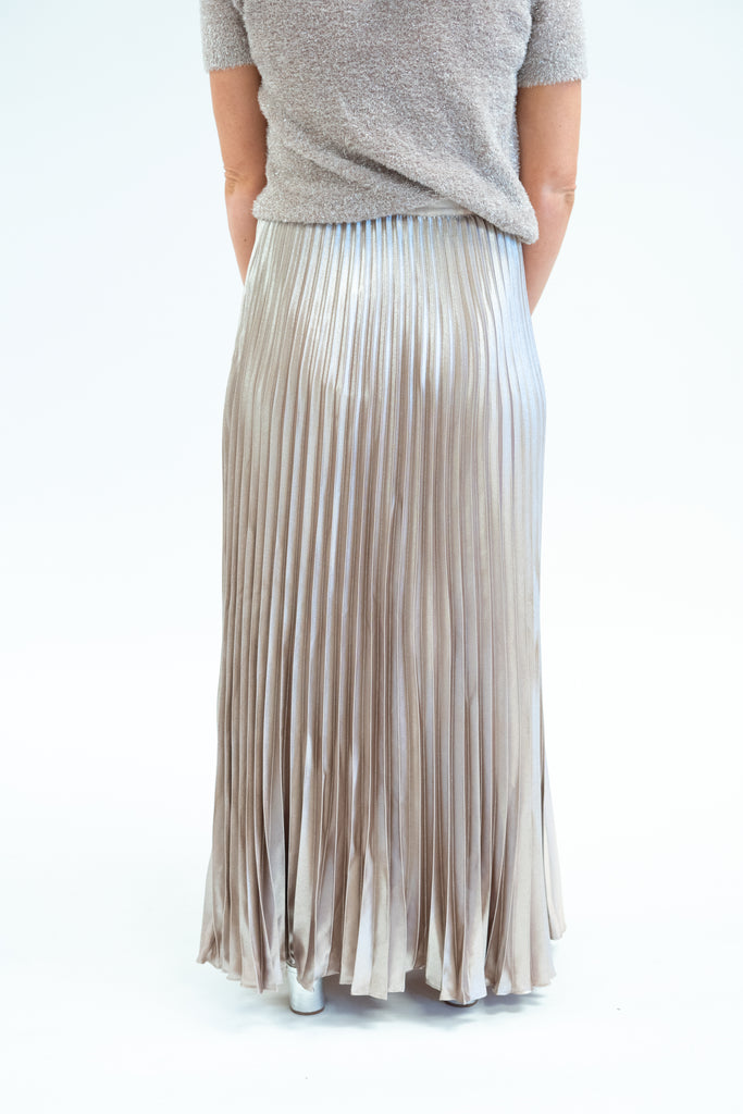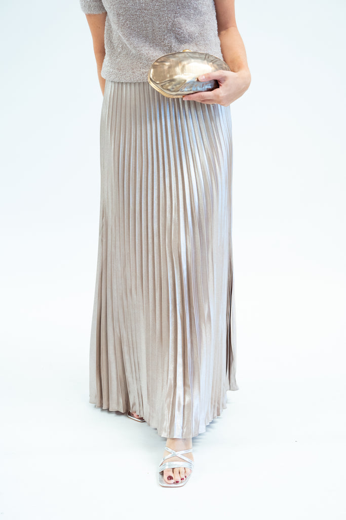 Soft metallic satin meets effortless elegance in the Marielle Metallic Satin Maxi Skirt. Its flowing pleats catch the light with every step, perfect for dinners, evening gatherings, or any moment that calls for a little polish.