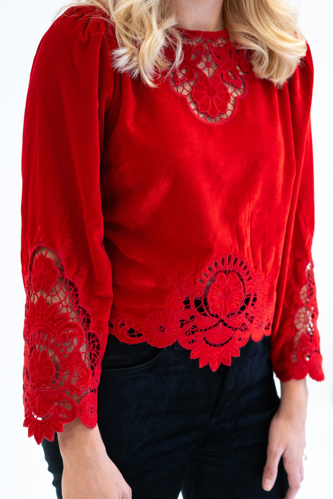The Alina Top in American Beauty features intricate floral embroidery cutwork on a rich red velvet fabric, blending romance and sophistication in one timeless silhouette. Perfect for elevating any look from day to night.