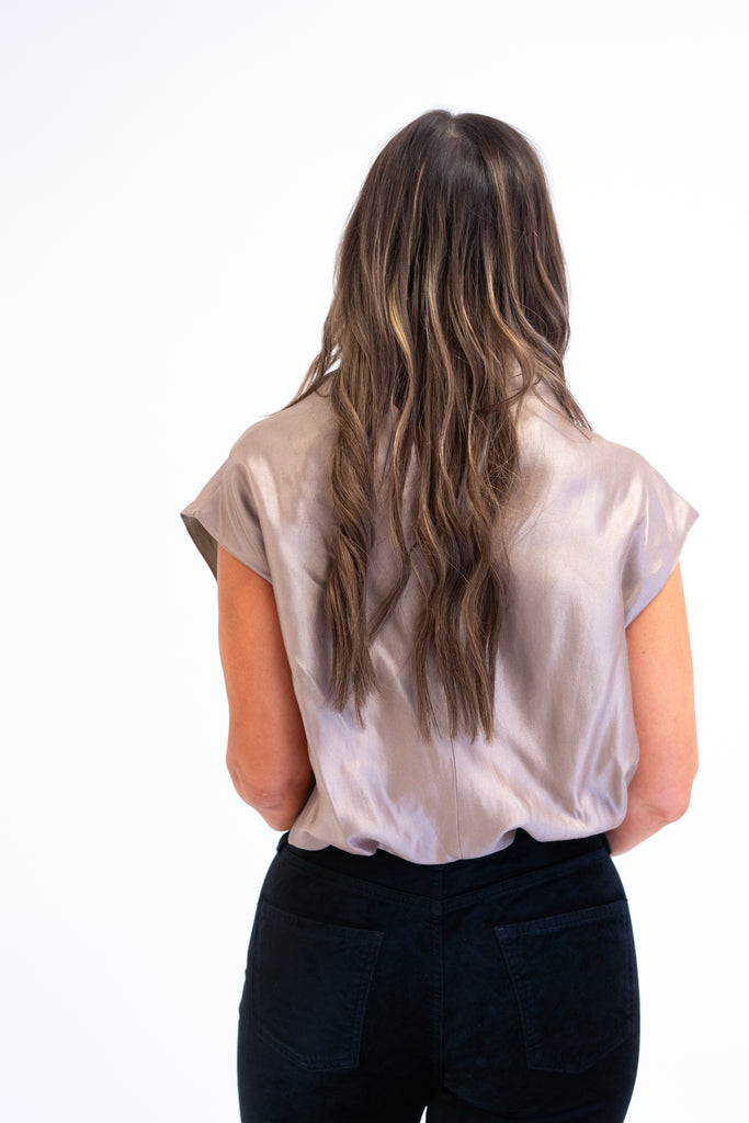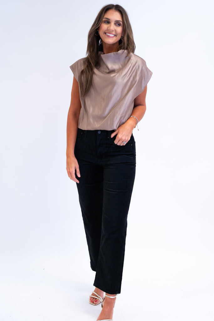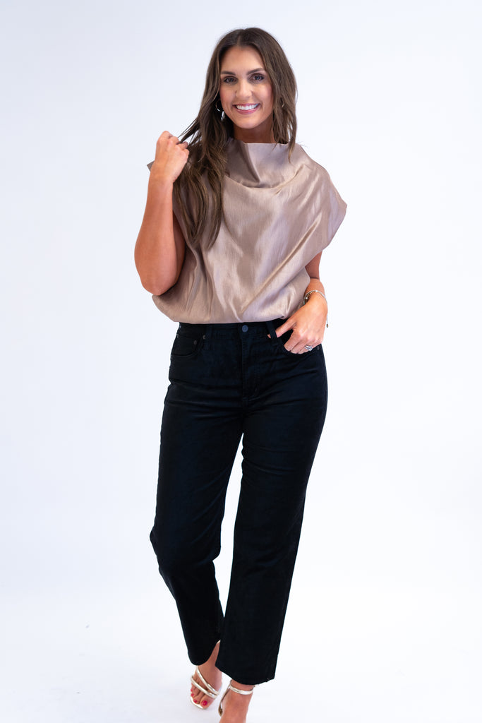 Expertly designed for holiday gatherings, this Sleeveless High Neck Top with Bubble Hem in mocha offers a sleek and elegant silhouette. The high neck and bubble hem add unique touches, while the slight shimmer adds a touch of glamour. Perfect for any occasion, this top is a must-have for any fashion-forward wardrobe.