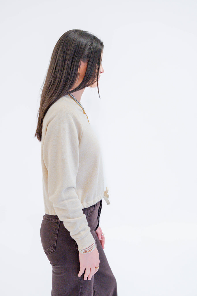 Long Sleeve Gold Fleck Tie Front Terry Sweatshirt in Ecru $118.00 size 34/XS 34/XS 36/S 38/M 40/L 34/XS 36/S 38/M 40/L Add to Cart This item is a recurring or deferred purchase. By continuing, I agree to the cancellation policy and authorize you to charge my payment method at the prices, frequency and dates listed on this page until my order is fulfilled or I cancel, if permitted. Please fill in the form below if you'd like to be notified when it becomes available. Your Email Send This site is protected by hCaptcha and the hCaptcha Privacy Policy and Terms of Service apply. Fit is TTS. Model is wearing and XS.