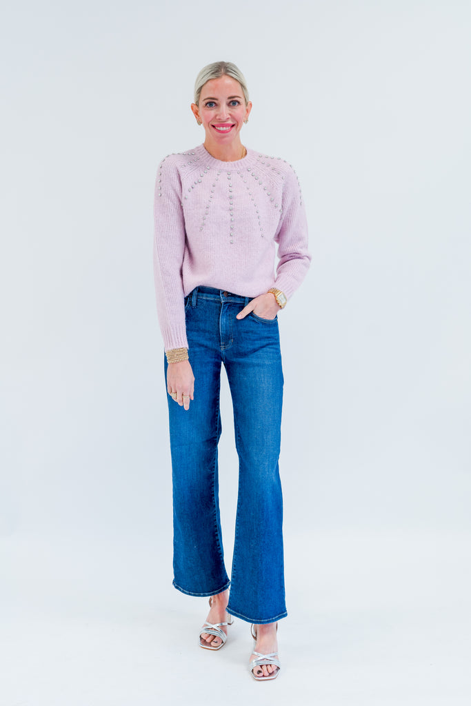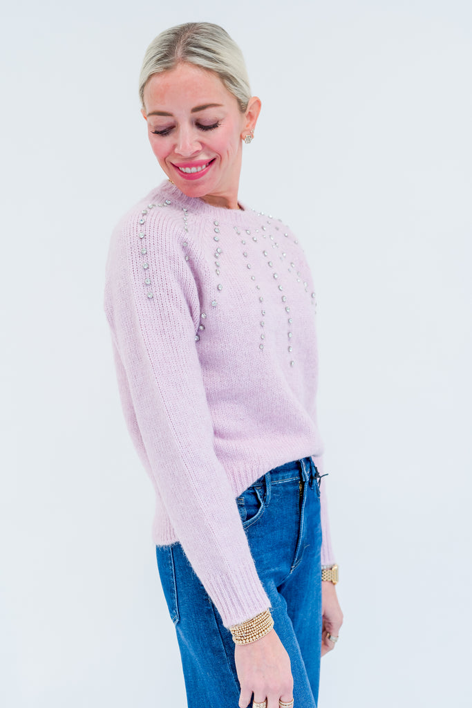Sparkle and shine in this gorgeous lilac rhinestone sweater that's basically a wearable work of art. Covered in glittering rhinestones that catch the light from every angle, it's the perfect piece for anyone who believes more sparkle is always better. Soft, cozy, and undeniably eye-catching, this sweater transforms an ordinary day into something special.