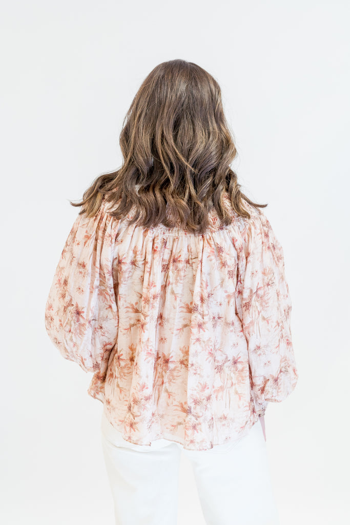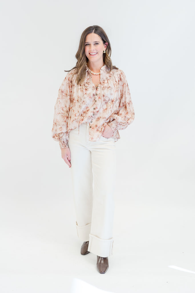 Embrace effortless charm with this delightful peasant top, featuring romantic smocking details at the collar and sleeves that add texture and movement. The warm rust floral print brings a cozy, vintage-inspired vibe perfect for layering or wearing solo. Comfortable and versatile, this piece transitions seamlessly from casual days to evening adventures. A wardrobe essential that celebrates timeless style with a modern twist.