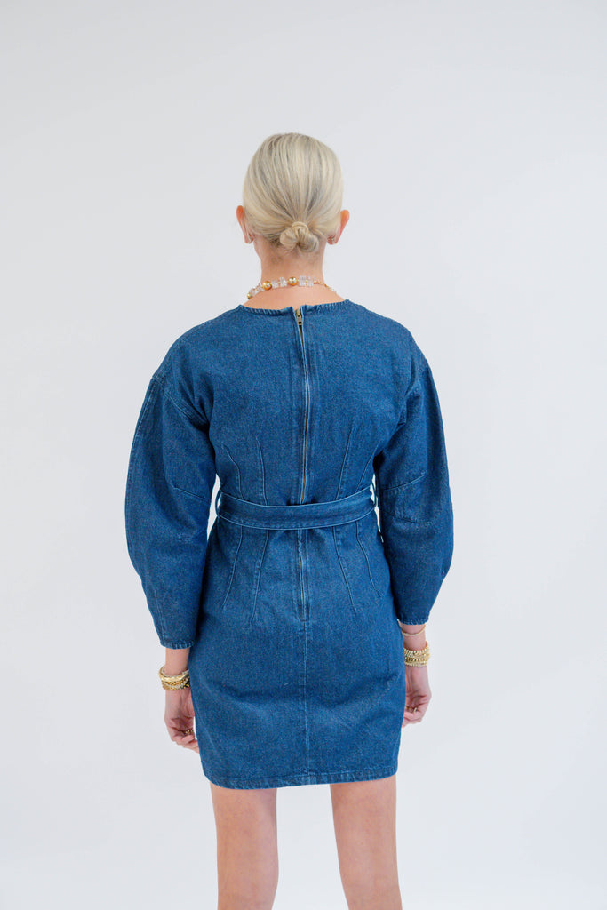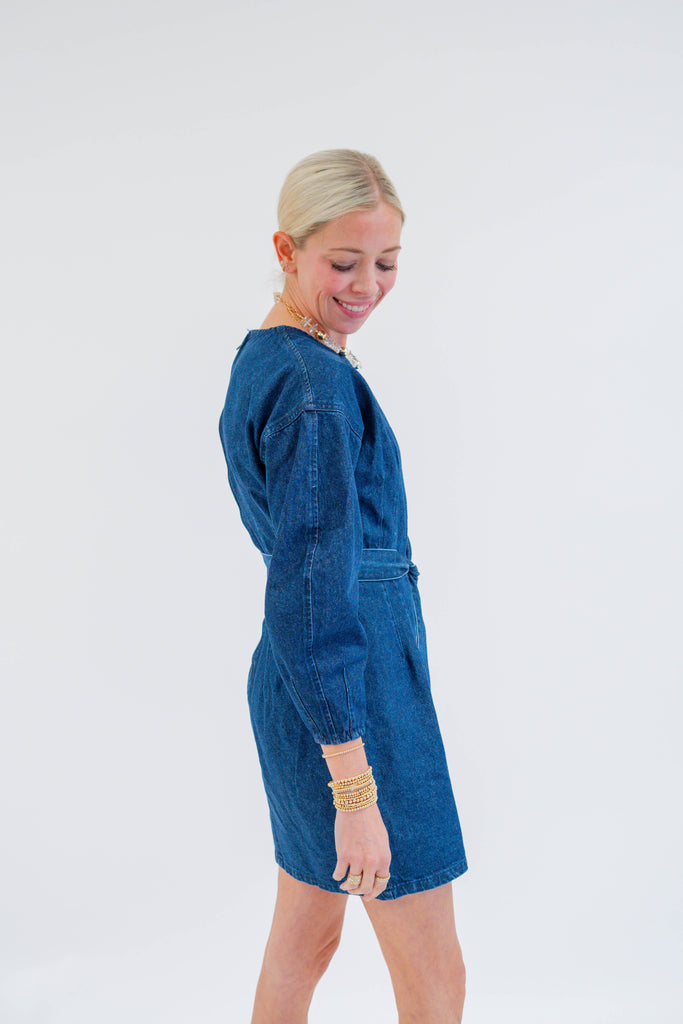 Crafted from comfortable denim, this dress features a flattering silhouette. It has long sleeves, a round neckline, and a self-tie belt to cinch the waist. Perfect for casual outings or dressed-up events.