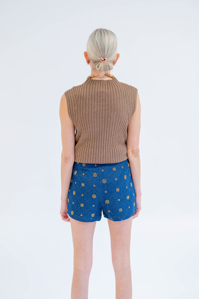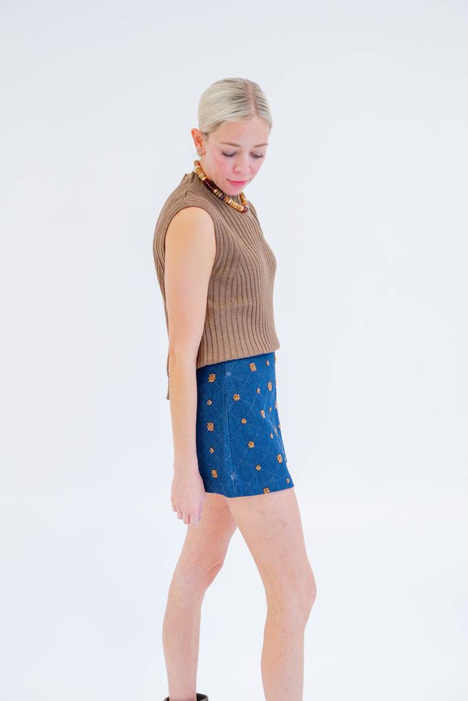 Where comfort meets chic: this embellished quilted denim skort offers the look of a mini skirt with the practicality of built-in shorts. Quilted denim with gold embellishment