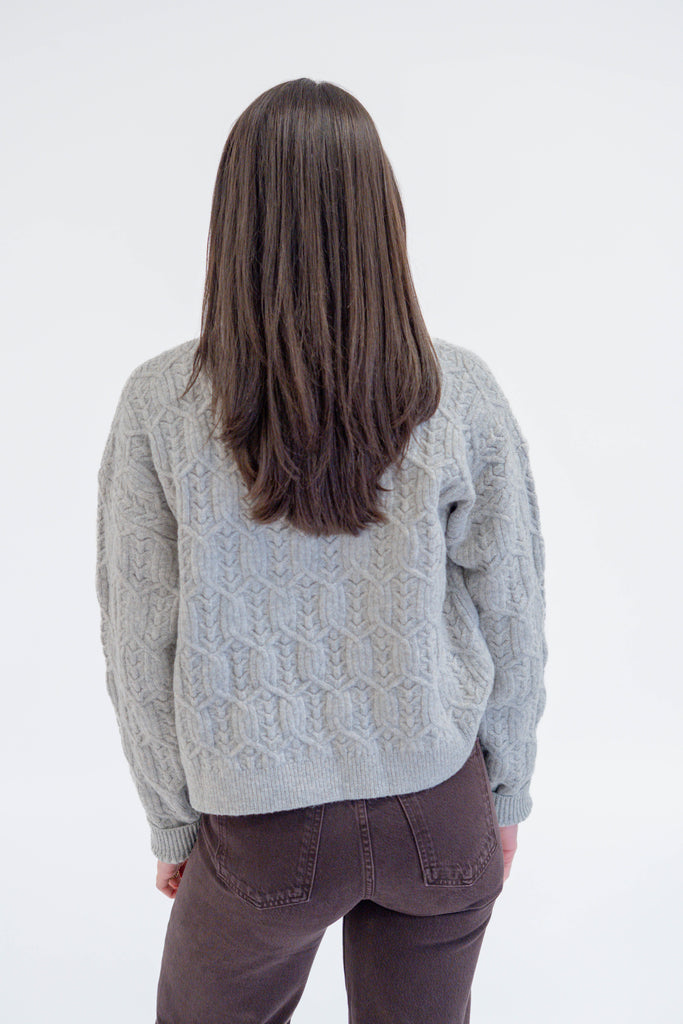 The Viola Pullover is a cable knit mock neck sweater in a classic grey shade, designed to carry you seamlessly from fall into winter. Its rich texture and refined fit provide both warmth and sophistication, making it a timeless addition to your wardrobe. Perfect for layering or wearing on its own, this sweater combines comfort with understated elegance for a polished seasonal look.