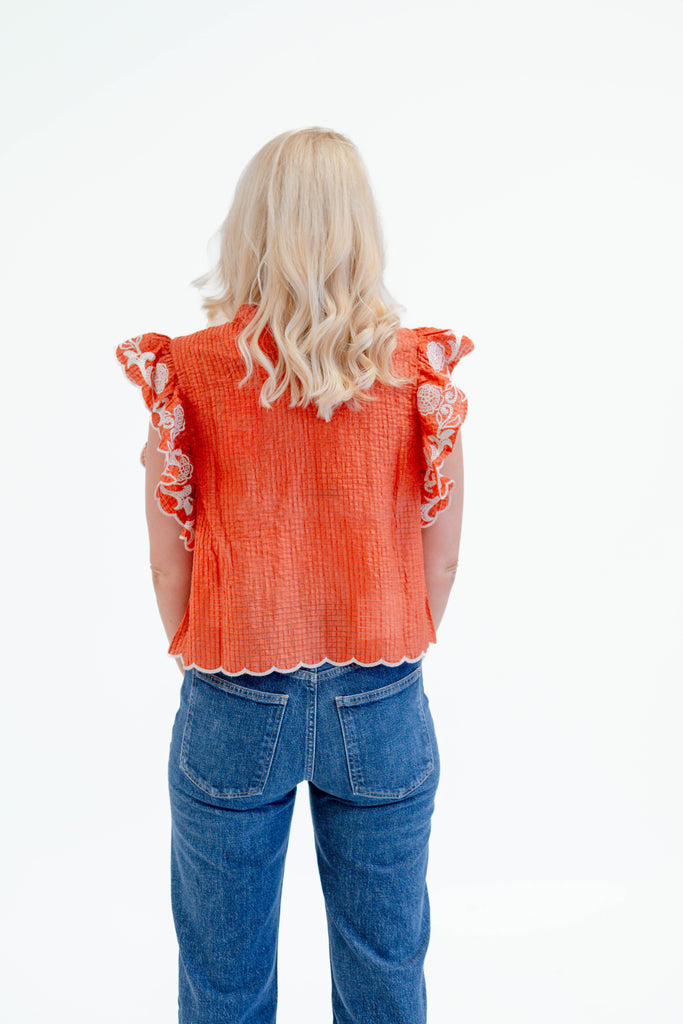 Scalloped Sleeve Embroidered Top In Rust $86.00 size S XS S M L XS S M L Add to Cart This item is a recurring or deferred purchase. By continuing, I agree to the cancellation policy and authorize you to charge my payment method at the prices, frequency and dates listed on this page until my order is fulfilled or I cancel, if permitted. Please fill in the form below if you'd like to be notified when it becomes available. Your Email Send This site is protected by hCaptcha and the hCaptcha Privacy Policy and Terms of Service apply. Model Wearing a Size XS