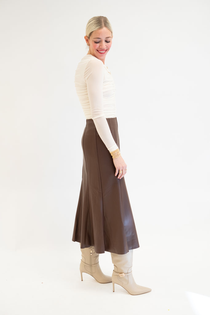 Elevate your essentials with this flattering ruched, long sleeve top. A subtle clasp detail completes the neckline with a refined touch, making it the perfect top for your next business meeting, night out with friends or casual weekend errands. Mesh ruched, long sleeve top with V-neckline with keyhole cutout and abstract gold button and loop closure. Model in size XS.