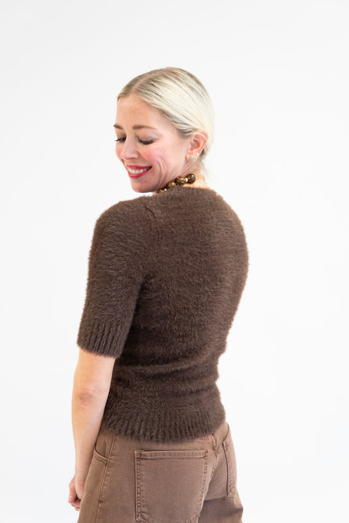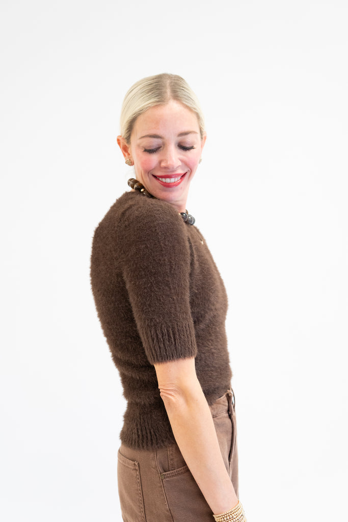 This top is crafted from a plush, fuzzy knit fabric in a rich espresso color. It features a fitted silhouette with elbow-length sleeves and a high, round neckline. The soft, textured material gives it a luxurious feel, while the simple yet elegant design makes it a versatile layering piece for any occasion. Self: 15% Polyester 50% Nylon 35% Viscose. Fit is slightly cropped.