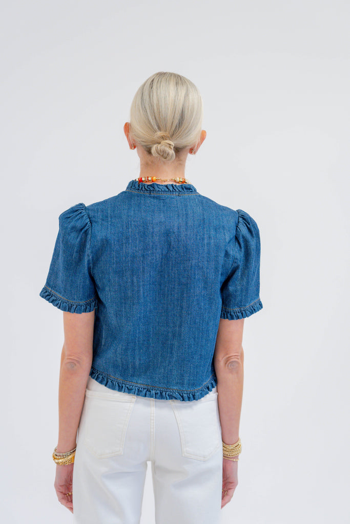 The Julie Denim top is the perfect fall transitional piece to pair with your favorite jeans, or cords. The ruffle detail adds the perfect amount of feminine detail! Size down for fit.