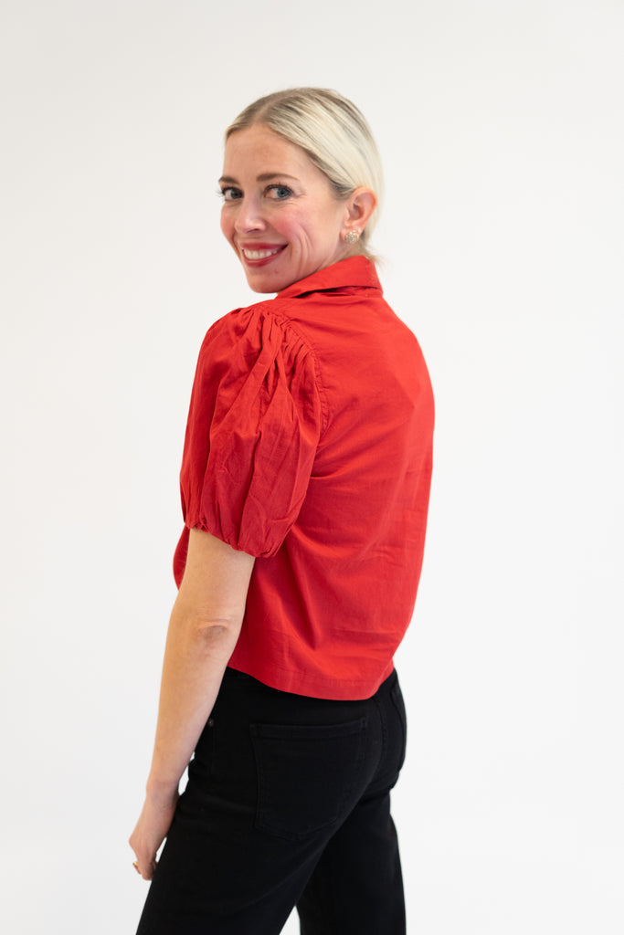 The Jamie Top in American Beauty is a modern take on the classic button-up, featuring soft ruching at the front and subtle puff sleeves for a flattering, feminine silhouette. Crafted in a rich red hue.