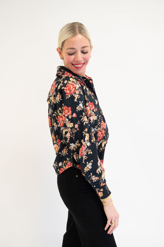 The Pippa Top in the Bonnard Floral print is a vintage inspired blouse. Designed with ruffles at the collar and sleeves cuffs, as well as covered buttons down the center front. Fits true to size.